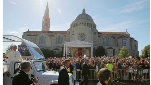 The Pope, speaking in Spanish, announces the coronation of Serra as saints, while leading a Mass in Washington attended by about 25,000 people.